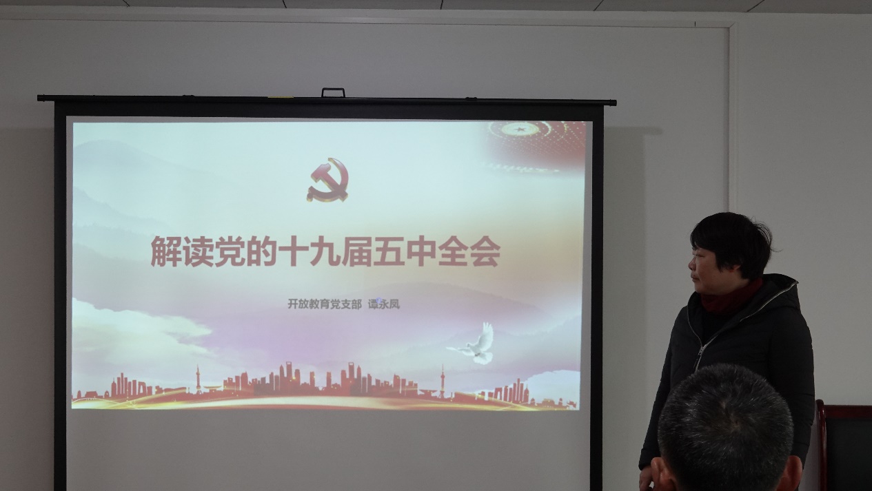 为贯彻落实学校下发的《中共贵州广播电视大学(贵州职业技术学院)委员会关于学习宣传贯彻十九届五中全会精神的实施方案》文件精神,2020年11月30日下午14:00,开放教育学院全体党员在15楼会议室上专题党课。党课由学院副院长谭永凤主讲。