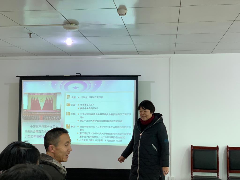 谭永凤同志以《解读党的十九届五中全会》为题,首先从党的十九届五中全会召开的背景,提出了党的十九届五中全会是三个“百年”背景下的五中全会,以国内国际视野分析了党的十九届五中全会召开的重要意义;其次,阐述了党的十九届五中全会公报主要内容,传达“十四五”时期经济社会发展的主要目标、远景目标以及实现这些目标的指导思想和必须遵循的原则;最后,以开启全面建设社会主义现代化国家新征程,必须要科学把握新发展阶段,深入贯彻新发展理念,加快构建新发展格局,对党的十九届五中全会精神主旨和内涵进行了全面宣讲和深刻阐述。