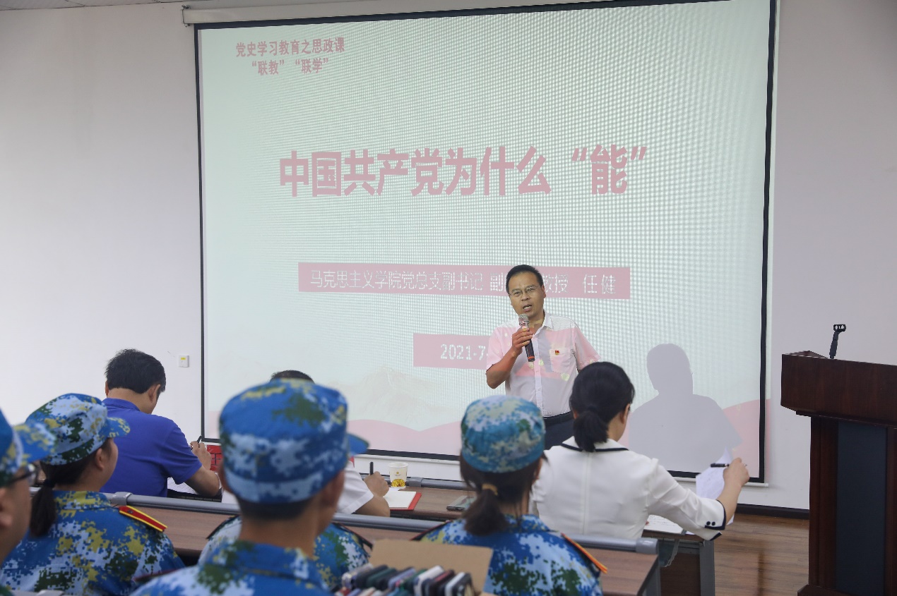 马克思主义学院任健老师以《中国共产党为什么“能”?》为题,分别从永不生锈的指南针——马克思主义、动力强大的发动机——人民、坚不可摧的船体——党的健康肌体三个方面阐述了中国共产党为什么“能”?