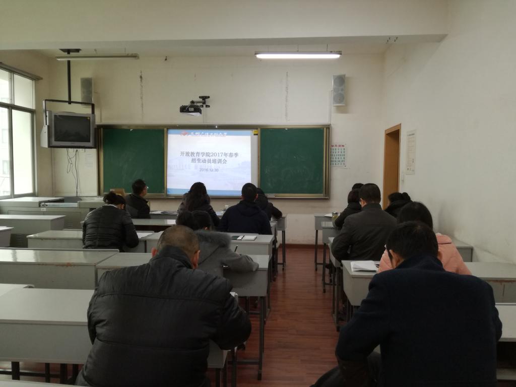 12月30日,开放教育学院在八鸽岩校区AB楼408教室举办了2017年春季招生动员暨招生业务工作培训会,全院教职工参加,会议由学院副院长李月波主持。