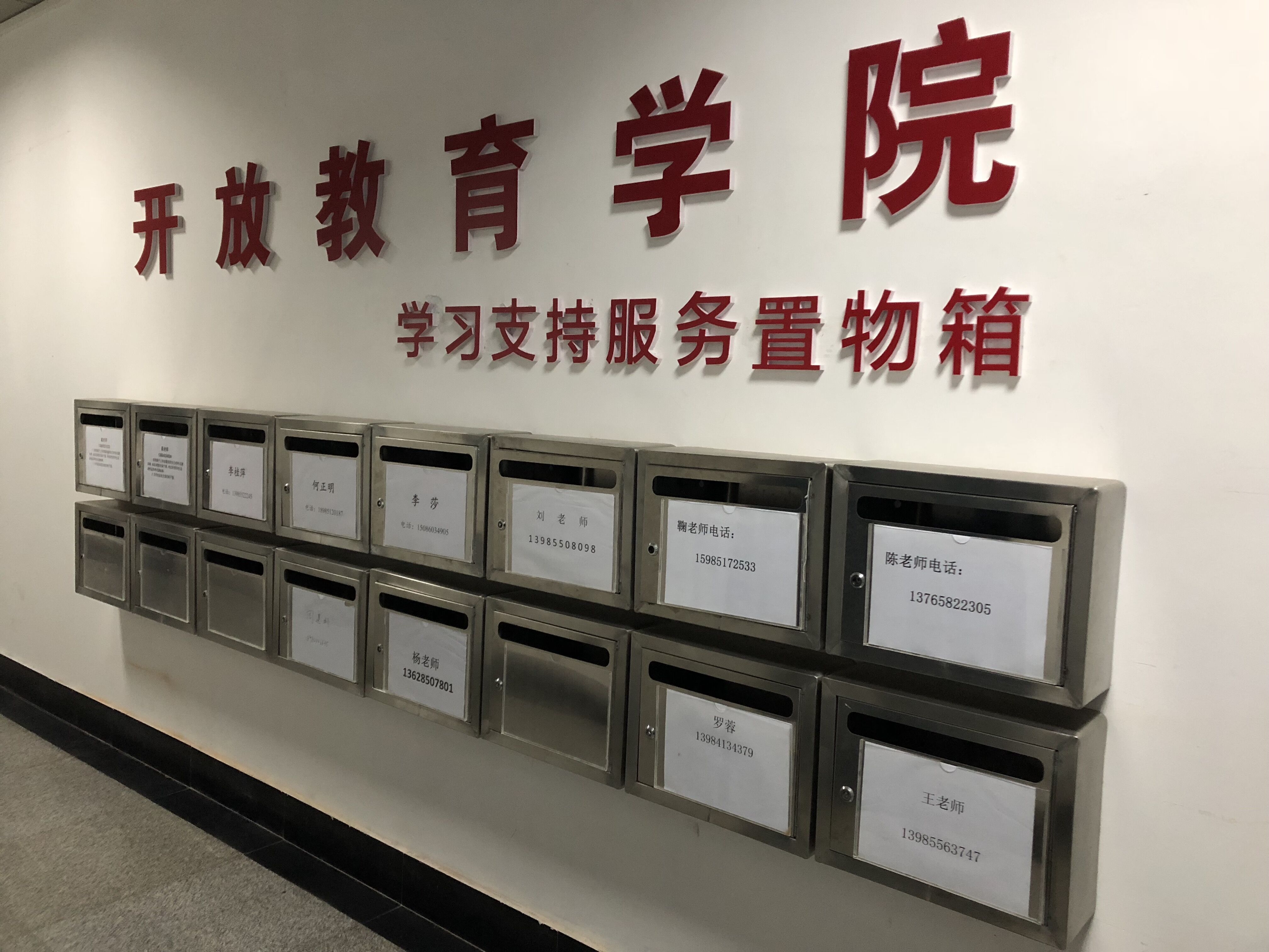 为了解决开放教育学院的学员在学院非工作时段前来交作业、论文以及领取考试通知单时找不到老师的困难,学院在辅导员办公室门口设置了学习支持服务置物箱。