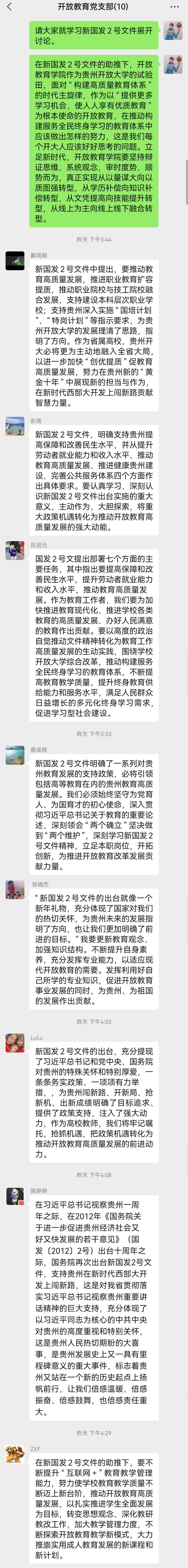 通过认真学习,教职工们积极讨论发表感想,《意见》的出台,充分提现了习近平总书记和党中央、国务院对贵州的特殊关怀和特别厚爱,一条条务实政策、一项项有力举措,为贵州闯新路、开新局、抢新机、出新成绩明确了目标追求、提供了政策支持,注入了强大动力,作为高校教育工作者,我们要更新教育观念、加强知识结构,不断提升自身素养,充分发挥专业能力,以适应现代开放教育的需要,发挥利用好自己所学的专业知识,主动作为,大胆探索,将重大政策机遇转化为推动开放教育高质量发展的强大动能;牢记嘱托,抢抓机遇,把政策机遇转化为推动开放教育高质量发展的前进动力。