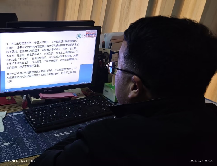 为推进开放教育“创优提质”战略,按照国家开放大学考试工作要求,贵州开放大学于 2024年12月23日上午在八鸽岩校区综合楼15楼会议室召开了2024年秋季学期期末考试工作会议。学校党委委员、副校长周勇参会并作讲话,开放教育学院各考点主要负责人和考务、教学工作人员同步收看了会议直播。